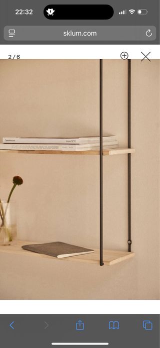 Estantería de pared con un diseño moderno y funcional. - Estructura metálica negra. - Baldas de madera.