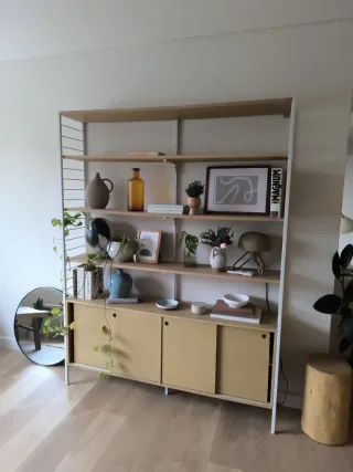 Se venden dos estanterías, una de ellas con un acabado en madera y la otra en blanco. - Estantería principal de color blanco. - Estantería secundaria con detalles en madera.