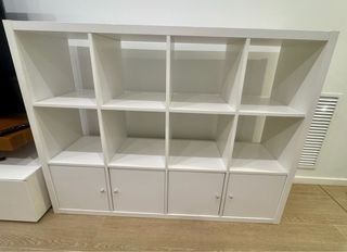 Estantería modular Kallax de IKEA en color blanco. Ideal para organizar tus libros, objetos decorativos o ropa. - 146,5cmx111,5 cm . - Incluye 4 accesorios con puertas. - Diseño moderno y funcional. -precio nuevo 160€