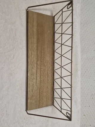 Elegante estantería de pared con un diseño moderno. 39,5x12x11 - Combinación de madera y metal. - Marco metálico con patrón geométrico. - Acabado en tonos marrones y dorados.