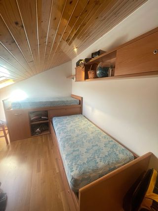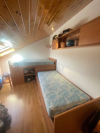 Conjunto de muebles para dormitorio con dos camas y estanterías integradas. Ideal para optimizar el espacio. - Dos camas individuales. - Estanterías de madera. - Diseño funcional. recogida a cuenta del comprador
