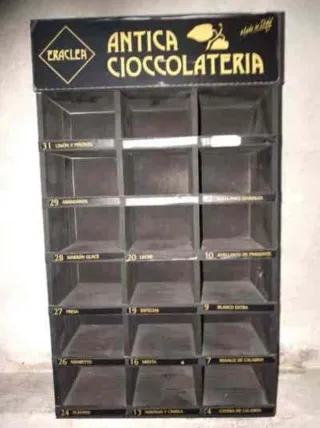 Expositor de madera para dulces o chocolates de la marca Antica Cioccolateria. -Tiene 18 huecos. Mide 59x34x13,5. Cada hueco mide 710x13 cm. de profundidad. -Cualquier duda preguntar. - Diseño de estanterías. - Estructura robusta.