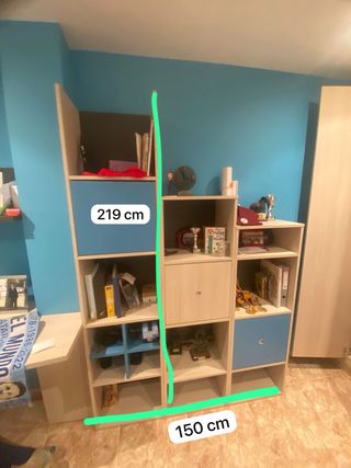 Estantería para empotrar en la pared, 3 compartimentos con puerta y 7 sin, diferentes medidas cajones anchos y con posibilidad de mucho almacenamiento. Seminuevo, ningún golpe y solo usado para objetos de decoración. La parte más alta mide 219 cm y total de largo 150 cm.
