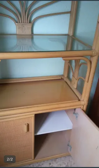 Mueble de mimbre con un diseño elegante y funcional. - Estructura de mimbre. - Estantes de cristal. - Puertas inferiores para almacenamiento.