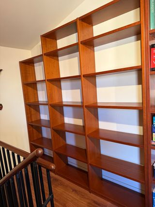 Estantería de madera con un diseño moderno y elegante. Ideal para organizar libros y objetos decorativos. - Estructura robusta de madera. - 17 baldas para almacenamiento. - 243 cm las 2 estanterias altas. - 214 cm la estanteria baja. - 75 cm del largo de cada balda. - 238 el largo de las tres estanterias.