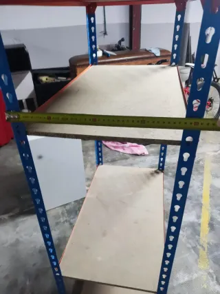 Conjunto de estanterías metálicas, con detalles en naranja. - Estructura principal en color azul. - Elementos adicionales en color naranja. Dos unidades por 30 euros. Son iguales que la de la foto que está montada. Se venden desmontadas.