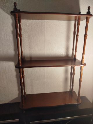 Estantería de estilo retro con un diseño clásico.EN MUY BUEN ESTADO, de madera ideal para exhibir pequeñas cosas. Es para colgar en la pared. - Tres niveles para exhibir objetos. - Patas torneadas y detalles decorativosNo esta magullada ni marcada