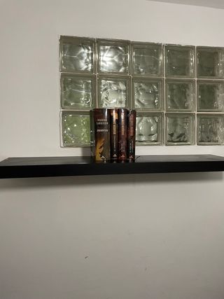 Estantería negra flotante de madera con un diseño moderno y minimalista. Ideal para colocar libros o elementos decorativos.
