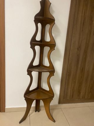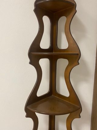 Preciosa estantería de rincón para darle un toque elegante a tu hogar. - Perfecta para espacios reducidos. - Diseño con huecos tallados. - Tres niveles de almacenaje.