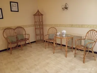 Conjunto de muebles de salón de madera maciza. Tiene algo de polvo pero está en buen estado - Mesa redonda con 4 sillas. - Mueble aparador con puertas y cajones. - Estantería con vitrina. - Mueble con escritorio abatible. - 2 estanterias