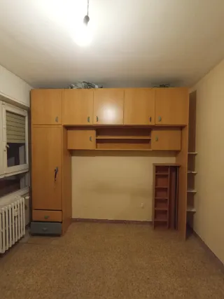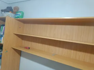 Mueble modular de madera color claro, ideal para optimizar el espacio. Permite integrar una cama de 1.35m en el centro. - Mueble de almacenaje superior con puertas. - Módulos inferiores con cajones y estantes. - Estanterías laterales. - Diseño funcional. Precio no negociable, está puesto hay que desmontarlo quien lo quiera