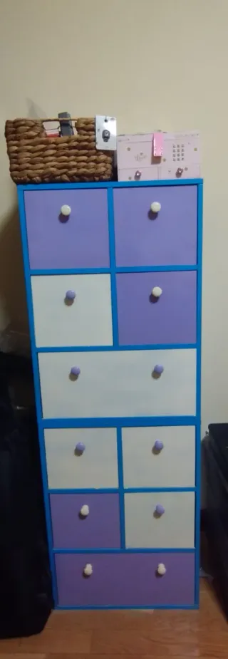 Organizador de madera repintado con un diseño moderno y colorido. Ideal para organizar tus objetos. - Marco exterior de color azul. - Cajones de diferentes colores: morado y blanco.