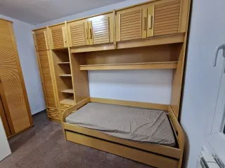 Conjunto de muebles de dormitorio con armario integrado y cama. - Estructura de madera. - Acabado en tonos beige y marrón. - Múltiples compartimentos de almacenamiento. - Dos camas con medidas 186cm X 85cm