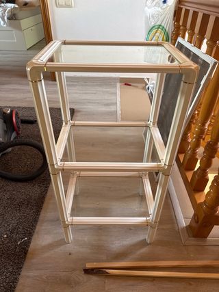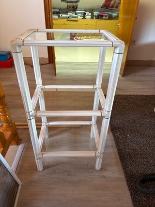 Práctica estantería auxiliar con un diseño moderno y elegante. - Estructura de metal plateado. - Tres baldas de cristal translúcido. -Se encuentra con signos y marcas en algunas zonas de la estructura de metal,el cristal en buen estado no roto,con algun signo El metal se puede arreglar pintando Medidas: -ancho 49 cm - fondo 30 cm -alto 73,5 cm