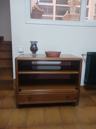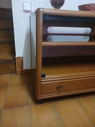 Mueble con estantería y cajón en madera de cerezo, con ruedas