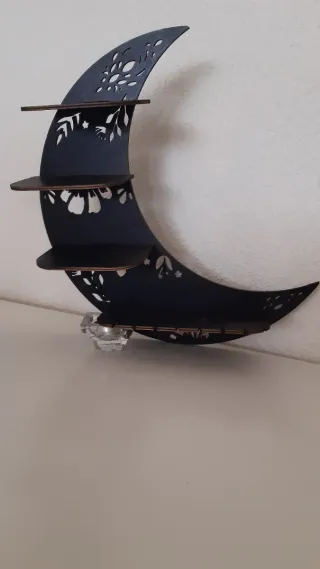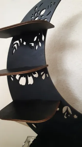 Estantería decorativa con un diseño único en forma de luna. - Fabricada en madera. - Acabado en color negro y detalles en marrón.
