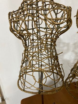 Conjunto de dos expositores con un diseño único y artesanal. - Estructura de metal resistente. - Revestimiento de mimbre tejido. - Base metálica estable.