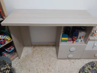 Mesa de escritorio con un diseño moderno y funcional. - Acabado en tonos beige y multicolor. - Combina materiales de madera y plástico para mayor durabilidad. Tiene un pequeño desperfecto en la parte baja del cajón.