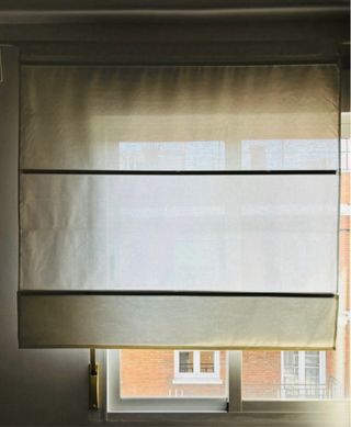 Estor enrollable de tela en color beige. Se enrolla fácilmente para controlar la luz y la privacidad. 250 x 100 cm