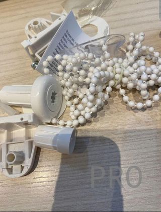 Estor enrollable de tela y plástico. - Color beige y blanco. - Mecanismo de cadena para subir y bajar.