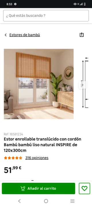 "Estor enrollable de bambú Inspire, indicado para uso interior. [...] Este estor incorpora barra de lastrado en bambú, tornillería, cadena y sistema de seguridad para niños. El mecanismo se coloca en el lado derecho. Es de fácil instalación a pared y fácil mantenimiento ya que se puede limpiar con un paño húmedo." Está como nuevo, porque solo estuvo puesto seis meses, pero se ha desenrollado la cuerda (en YouTube hay tutoriales para colocarla de nuevo).