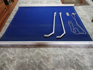 Se venden dos toldos tipo estor con mecanismo de subida y bajada mediante cadena. - Estructura de metal. - Lona de tela azul.