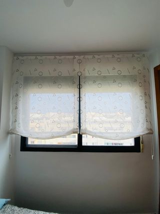 Estor para ventana hecho en tienda de cortinas.Esta compuesto del estor en si más el volante.Esta como nuevo,sin manchas ni roturas.El volante mide 190 cm de largo y 37 de alto.El estor mide 147 de ancho y 160 de alto.Lleva velcro para desmontar y lavar.