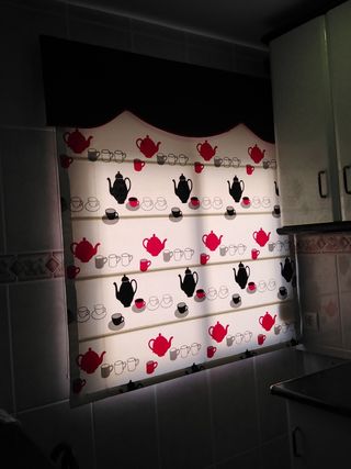 Se vende estor de cocína y bandon con dibujo de teteras rojas y negras. Su edtado es nuevo, se encuentra en perfectas condiciones y sin señales de uso. Hecho a mano. El mecanismo se vende por separado. Tamaño 130 largo x 123 ancho