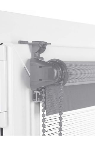 Estor enrollable de tela y plástico. Su diseño combina tonos grises y blancos, aportando un toque moderno a cualquier estancia. - Mecanismo de recogida. - Cordón para subir y bajar.