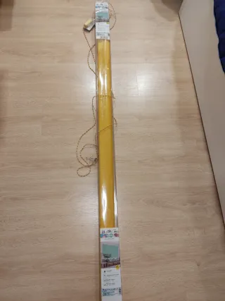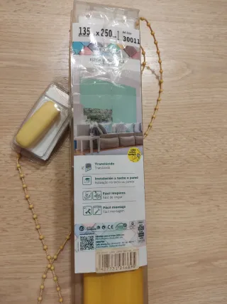 Estor enrollable de color amarillo, con unas medidas de 135x250 cm. Ideal para cualquier estancia. Nuevo, sin estrenar. - Tejido de poliéster. - Incluye cadena para su accionamiento. - Translúcido - Instalación a techo o pared - Fácil de limpiar - Fácil montaje