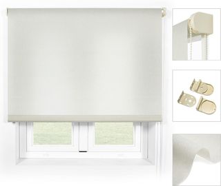 Dos estores enrollables de tela en color beige. Listos para instalar. - Mecanismo de cadena para subir y bajar. - Incluye soportes de montaje.