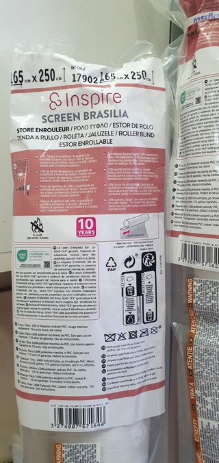 Estor enrollable de la marca Inspire, modelo Screen Brasilia. Mide 165 cm de ancho por 250 cm de largo. - Tejido 100% poliéster con recubrimiento de PVC. - Certificado OEKO-TEX® STANDARD 100. Ojo! Se compone principalmente de un tejido unido a un tubo de aluminio (eje). Faltan las piezas pequeñas.