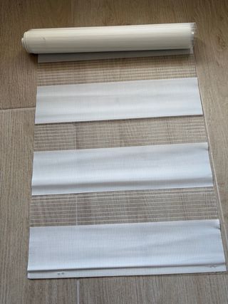 Estor enrollable de doble capa con diseño Noche y Día. Combina franjas transparentes y opacas para regular la luz. - Medidas: 30 x 210 cm. - Color: blanco. - Nuevas - Las fotos del estor montado son de referencia de otras que tengo montadas con otras medidas.