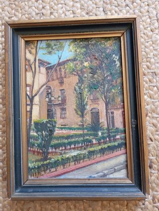 Antiguo cuadro al oleo de la plaza de Santa Cruz de Zaragoza, se aprecia la farola central con la cruz, y su antigua configuración de jardines y los árboles muy delgaditos , hoy en día robustos y gruesos. Un testigo artístico del paso del tiempo de esta emplematica y bella plaza de Zaragoza. Autor desconocido de 1940. Se puede investigar. Admito ofertas.
