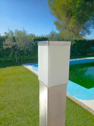 Farol de diseño en acero inoxidable y cristal al ácido para exterior con certificación IP44 Marca EGLO modelo Calgary , para bombilla de 60 W máximo y conecta le a la luz eléctrica. Sin estrenar. Vendo uno por 22, si te llevas dos te los dejo en 40€