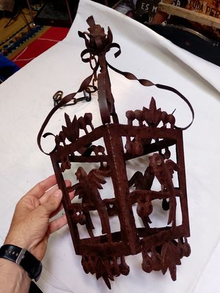 Preciosa lámpara antigua de hierro forjado. Ideal para decoración rústica o vintage. Medidas: 52 cm de alto, 20 cm de lado. Cadena: 47 cm. En buen estado, sin zonas debilitadas y protegida con una patina de laca para metal y evitar el proceso de oxidación. - Fabricada en hierro. - Diseño con pájaros y detalles florales. - Presenta pátina de óxido, acorde con su antigüedad - Con cadena para colgar.