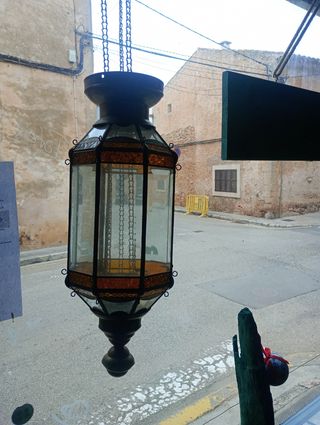 Se trata de un farol o lámpara colgante de estilo marroquí o andalusí. Estas lámparas son elementos decorativos y funcionales que: Son elaboradas artesanalmente, a menudo con forja o chapa de hierro y cristales de colores. Crean un ambiente cálido y relajante mediante el juego de luces y reflejos. Se pueden utilizar tanto en interiores como en exteriores, como jardines, terrazas o teterías. Forman parte de la artesanía árabe tradicional y son un elemento decorativo clave para un estilo oriental. Pueden usarse con velas o con instalación eléctrica.