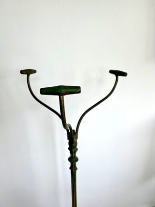 Perchero antiguo de hierro forjado. Años 20. Pintado en verde con desgaste propio de los años que tiene. MEDIDAS: Altura: 117 cm Diámetro entre Perchas: 32 cm Diámetro entre patas: 44 cm Moble / mueble / cadira/ silla / restaurado / antiguo / antic / mesa / taula / decoración/ decoració / sofá / sillón/ butaca / retro / customizado / vitrina / bufet / buffete/ Ikea / maison du monde / consola / nit / noche / roure/ chene/ iluminación, farolas, foco,