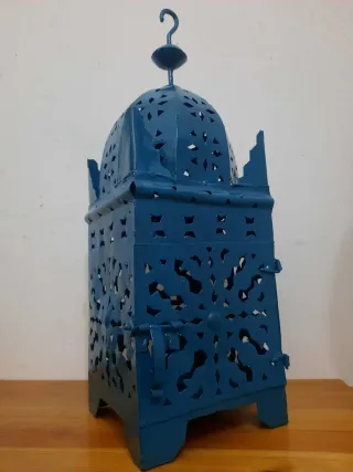 Este farol colgante de metal presenta un diseño intrincado y elegante. - Acabado en color azul. - Fabricado en metal resistente. - Ideal para decoración.