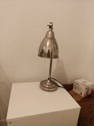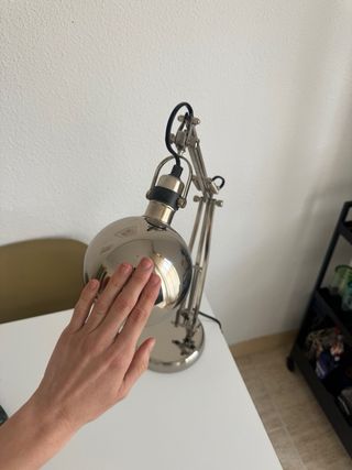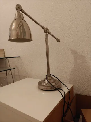 Lámpara de escritorio plateada con brazo articulado. Incluye bombilla. - Diseño moderno y funcional. - Base estable para colocar en cualquier superficie. - Brazo ajustable para dirigir la luz. - Cable de alimentación con interruptor.
