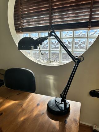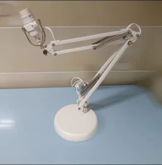 Lámpara de escritorio tipo arquitecto, ideal para cualquier espacio de trabajo o estudio. Su diseño articulado permite ajustar la luz con precisión. Funciona perfectamente y está en buen estado. Recogida barrio de la Concepción. - Brazo articulado con resortes. - Base redonda estable. - Portalámparas para bombilla.