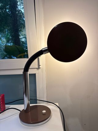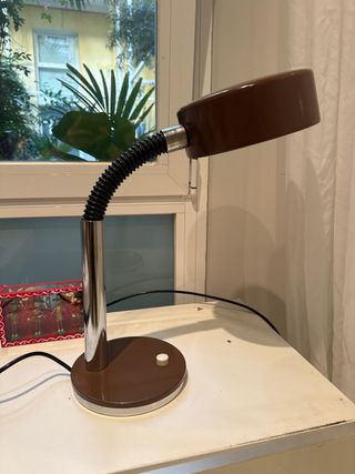 Flexo de diseño vintage con un estilo retro de los años 70. Su acabado combina tonos marrones y plateados, aportando un toque distintivo a cualquier espacio. - Base redonda y estable. - Brazo flexible para ajustar la luz. - Interruptor en la base.