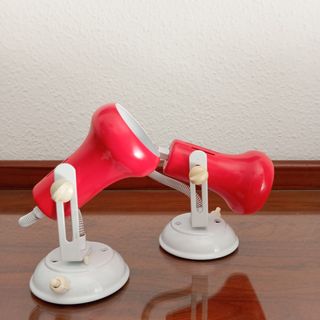 pareja de apliques vintage de pared tipo flexo, estructura metálica lacada en blanco y rojo , foco orientable con pulsador de encendido en la base. lámparas Originales de los años 70. PRECIO POR LA PAREJA Medidas alto 16 cm diámetro de la base 8 cm largo foco 11cm Fase Tramo Acapri Lamsar Guzzini Pilma Stilnovo Vintage Oluce Grin Maof Lupela Kartell Valenti Metalarte Artemide - Ideales para dar un toque retro a cualquier estancia. - Perfectos para colocar en una mesita de noche o en un escritorio. - Se encuentran en buen estado.