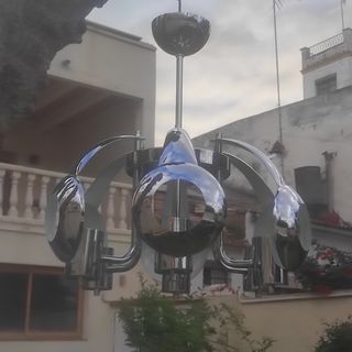 Lampara vintage con cuerpo cromado en buen estado y 5 estructuras rodeando los portalámparas de tamaño pequeño k Medidas: 55 cms de alto (desde la parte inferior al copete) y 60 cms de diámetro aproximadamente Bombillas de casquillo pequeño. instalación eléctrica revisada En buen estado. Envíos a través de Correos Wallapop. Preguntar antes de comprar Instalación eléctrica revisada space age modernista art deco NOUVEA fase retro pop. Bondia Hispana Cartuja flexo arquitecto italiano Manises cerámica RETRO ANTIGUO MID CENTURY DISEÑO INDUSTRIAL ANTIGUA ANTIGÜEDAD AÑOS 50 60 70 80