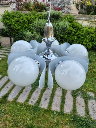 Lampara vintage Space age con 5 opalinas globos con aros rodeándolos. En buen estado Preguntar antes de comprar Instalación eléctrica revisada space age modernista art deco NOUVEA fase retro pop. Bondia Hispana Cartuja flexo arquitecto italiano Manises cerámica RETRO ANTIGUO MID CENTURY DISEÑO INDUSTRIAL ANTIGUA ANTIGÜEDAD AÑOS 50 60 70 80 METALÚRGICA CERVERA MAOF GEI LUPELA POP DECO NÓRDICO TALLER ATELIER ATREZZO industrial sputnik Mazzega stilnovo fase Gaetano Sciolari escandinavo flos interiorismo estiluz