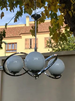 Lampara vintage estilo Space Age, con cuerpo cromado en buen estado y 5 globos transparentes rodeados por aros metálicos, es única Medidas: 63 cms de alto x 60 cms de diámetro aproximadamente Bombillas de casquillo pequeño. Envíos a través de Correos Wallapop Preguntar antes de comprar Instalación eléctrica revisada space age modernista art deco NOUVEA fase retro pop. Bondia Hispana Cartuja flexo arquitecto italiano Manises cerámica RETRO ANTIGUO MID CENTURY DISEÑO INDUSTRIAL ANTIGUA ANTIGÜEDAD AÑOS 50 60 70 80 METALÚRGICA CERVERA MAOF GEI LUPELA POP DECO NÓRDICO TALLER ATELIER ATREZZO industrial s