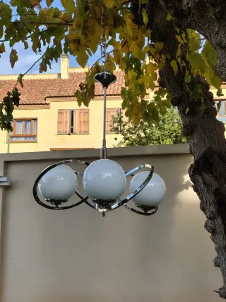 Lampara vintage Space age con 6 opalinas globos blancos, con brazos torneados que terminan en 2 alturas y las luces en 2 niveles. Cromado en buen estado. Medidas: 41 cms de alto x 46 cms de diámetro aproximadamente Preguntar antes de comprar Instalación eléctrica revisada. Portalámparas de tamaño pequeño. Envíos a través de Wallapop Correos. space age modernista art deco NOUVEA fase retro pop. Bondia Hispana Cartuja flexo arquitecto italiano Manises cerámica RETRO ANTIGUO MID CENTURY DISEÑO INDUSTRIAL ANTIGUA ANTIGÜEDAD AÑOS 50 60 70 80 METALÚRGICA CERVERA MAOF GEI LUPELA POP DECO NÓRDICO TALLER ATELIER ATREZZO industrial sputnik