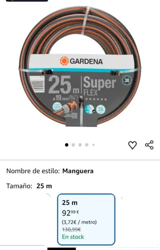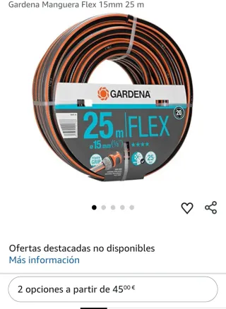 Manguera de jardin Gardena Comfort Flex MarcaGardena MaterialPlástico ColorNeutro Dimensiones del producto24,1l. x 23,7an. centímetros Peso del producto2,62 Kilogramos Presión máxima25 Bar Rollo de 15 m