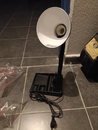 Preciosa lámpara de escritorio de metal mas bombilla. Es de color negro y tiene un diseño elegante y moderno. - Ideal para iluminar tu espacio de trabajo o estudio. - Su brazo flexible permite ajustar la dirección de la luz fácilmente. - Perfecta para añadir un toque de estilo a tu hogar u oficina.