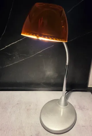 Flexo de escritorio con un diseño moderno y funcional. Su brazo flexible permite dirigir la luz fácilmente. - Pantalla de plástico naranja. - Base y brazo de metal plateado.